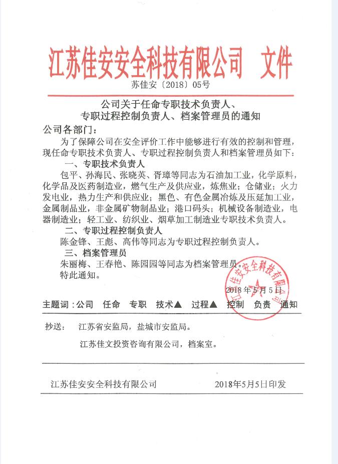 公司关于任命专职技术负责人、过程控制负责人、档案管理人员的通知